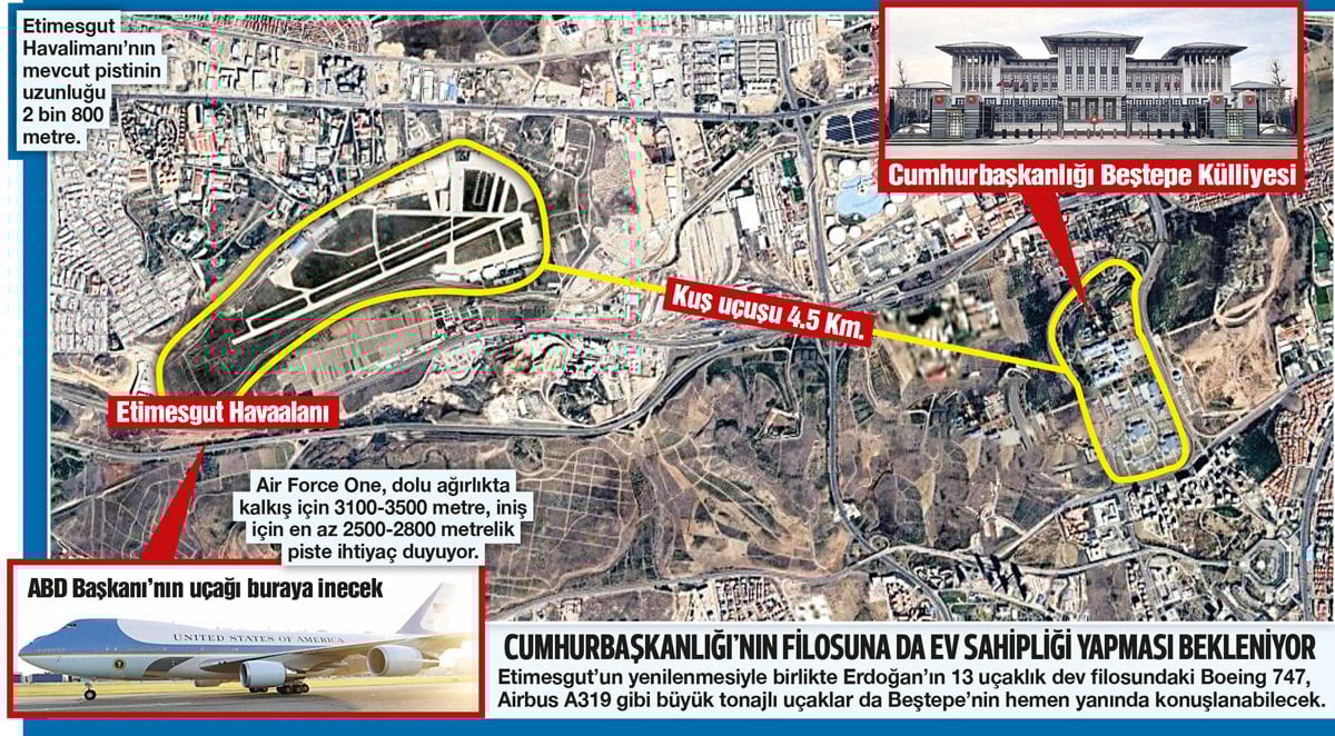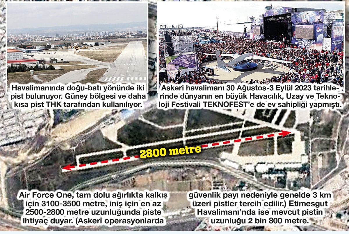 ABD Başkanı Trump ile 32 ülkenin devlet başkanları 7-8 Temmuz 2026’da Ankara’daki NATO Zirvesi’nde buluşacak. Atatürk tarafından 1935’te açılan ve bugüne kadar askeri amaçla kullanılan Etimesgut Havalimanı da bu toplantı için hazırlanıyor. Zirveye ‘Air Force One’ ile gelecek Trump ile diğer  başkanların uçakları Etimesgut Havalimanına inecek. Ancak mevcut pistin uzunluğu 2 bin 800 metre. Trump’ın uçağı ise iniş için daha uzun piste ihtiyaç duyuyor.