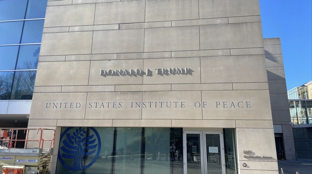 USIP’nin binasının girişinde “ABD Barış Enstitüsü” yazan kısmın hemen üstüne “Donald J. Trump” yazısı eklendi.
