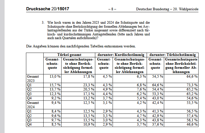 2023 ve 2024 yıllarında Türk kökenlilerin ilticalarının kabul oranları, Kürt kökenli olduğunu söyleyenlerin 10 katından fazla oldu.