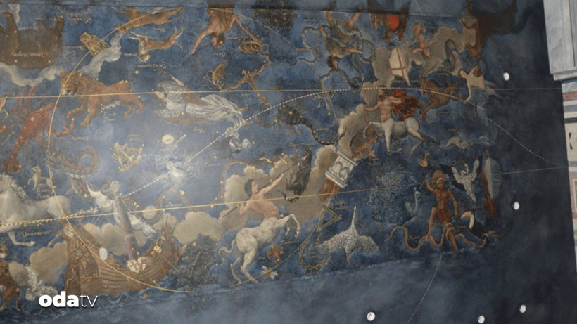 Yapının içi ürkütücü sayılabilecek ayrıntılarla dolu: Tavandaki çizim bir doğum haritası ve burçların tasvirlerini andırıyor.